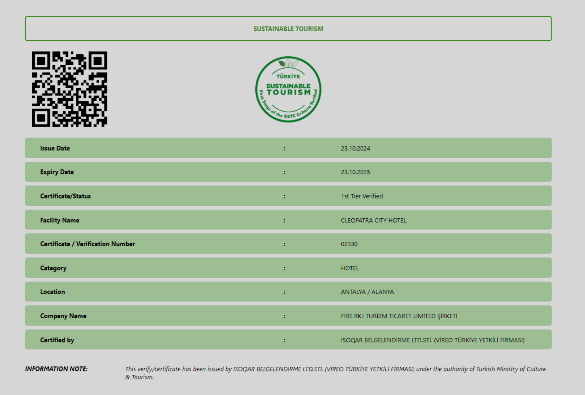 Sustainable Tourism Verification – Türkiye Issued by: ISOQAR Certification Ltd., accredited by TÜRKAK, recommended by TGA (Türkiye Tourism Promotion & Development Agency) Verification No: IQR-V1-HI-02330 First Verification Date: 23.10.2024 Issued On: 23.10.2024 Expiry Date: 23.10.2025 Facility Type: Accommodation Facility The hotel complies with the Türkiye Sustainable Tourism Standard (Version 1.0 – 19 May 2022).